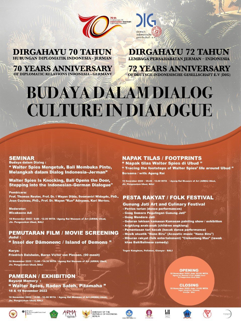 - Tahun 2022: bekerja sama dengan DIG menyelenggarakan acara Budaya dalam Dialog, Peringatan 70 Tahun Hubungan Indonesia Jerman dan 72 Tahun DIG, di Ubud, 18 dan 19 November 2022.